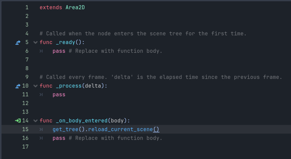 I’ve added kill zones into my game for the player to run into, to make the game more difficult to play. I’ve done this by adding a new node in the top left next to node 2D and named it kill zone, using the collision drop down menu, changing the mask on the inspector tab on the right too 2 instead of 1. Adding to the script, going to the node tap on the right and selecting the right signal this is the long list of red arrow keys .In between the blue and pink text on line 15 I added on_body_entered so that the character that is stated as body by the engine will collide with these zones and reload so when the character for example falls off the map the game will reload and won’t crash which was an issue ive had before.