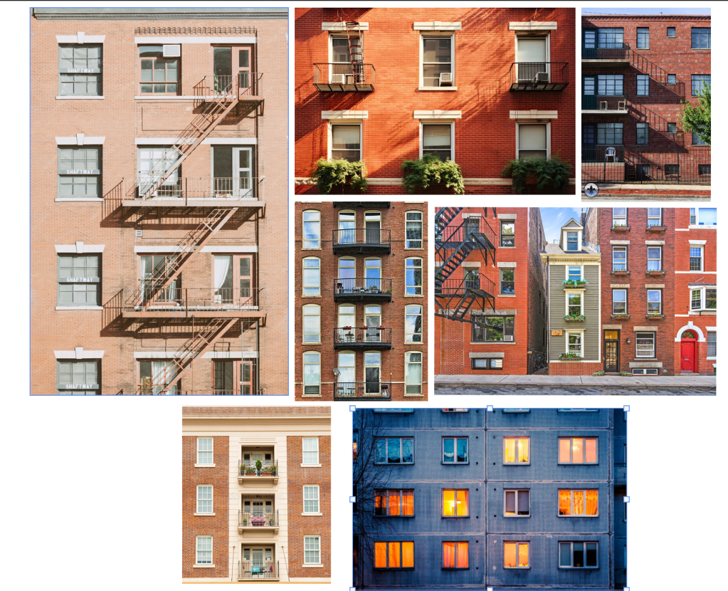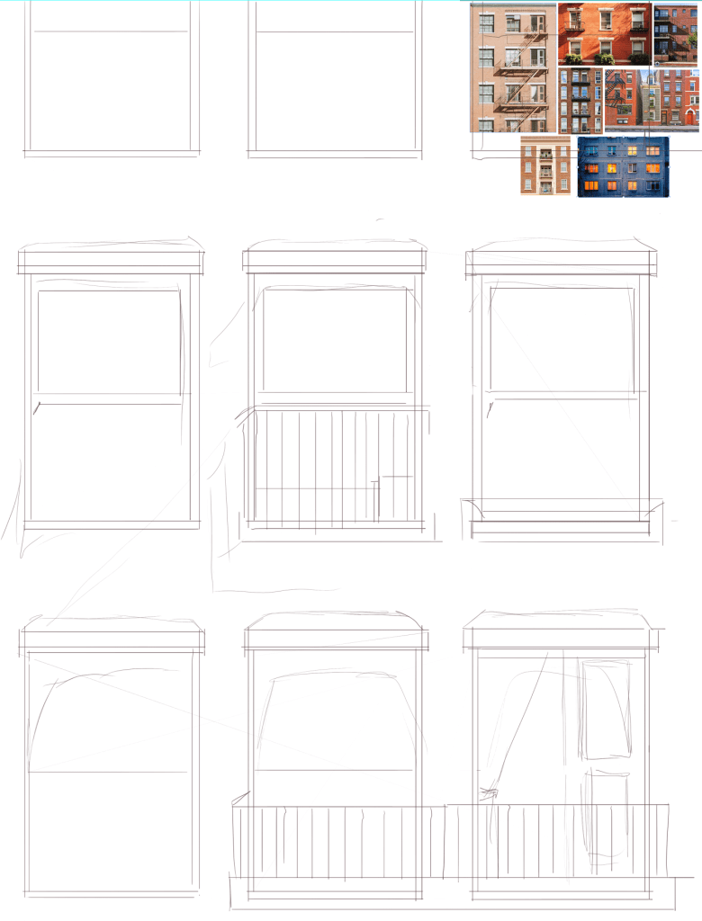 I also collected some photos for inspiration on what i want the building to look like. i have gravitated more towards bigger windows since then it will be easier to see the animation and there will be less of the building to draw. i also would like it to be an apartment complex so it would be possible for people to be completely different even though they live right next to each other. i would like my animation to be panning up the building and end when it reaches the top, i think this will be easier then going side to side.