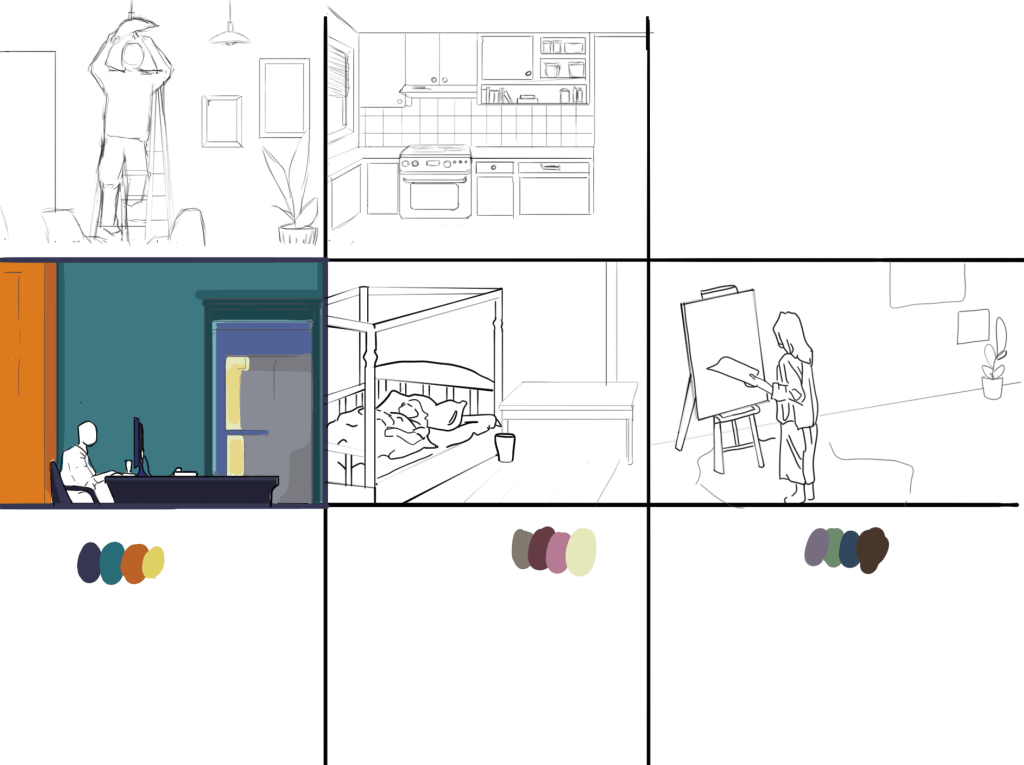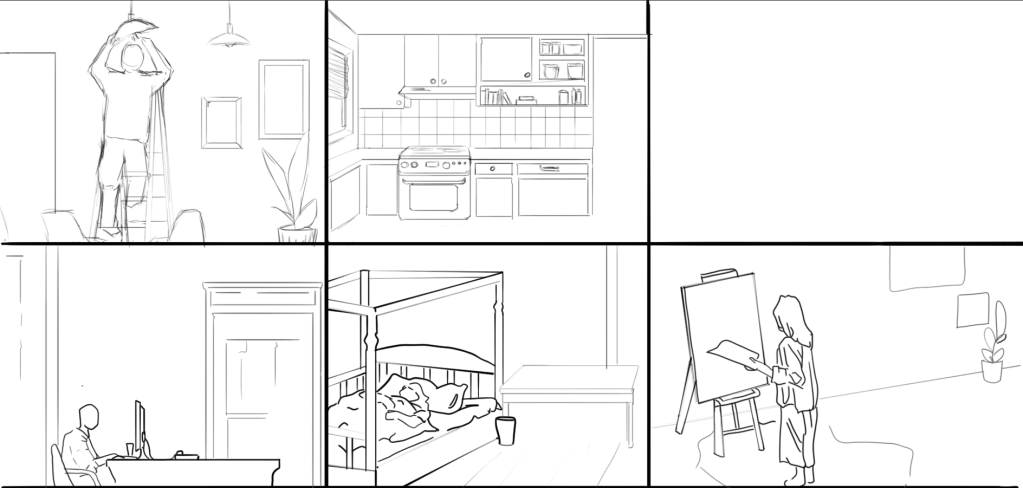 These sketches are a collection of some ideas i have for the activity’s happening in a few of the windows, however i am waiting to take my reference pictures that i will use for my final animations so these are not accurate. I am mainly using them to practice and figure out the colours for each window, since i would like each one to be different. This is also important because the videos will be taken from the same floor of the flat, so i can’t use the colours from the original video because they will all be the same.