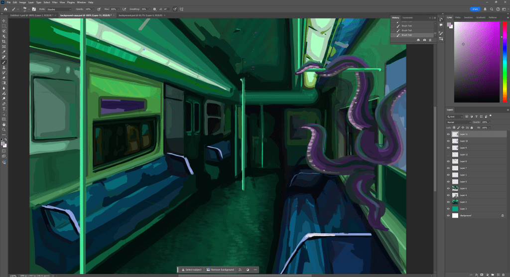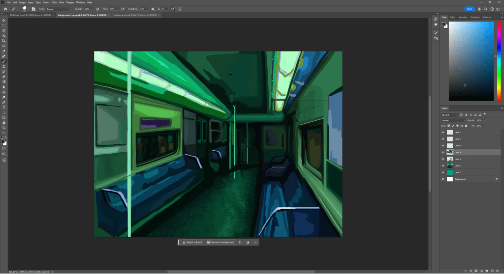 Once I did that I used blocks of colour to carve out the values and see if the green hue would mess with the perception that its a train, since my reference was realistic colours . I tried to use the lasso tool but found it was easier to just paint it by hand, however this did take a lot longer. I think it would have been easier to draw this if I separated it with layers more so I could use bigger brushes on the bottom layers and add more detail over the top, since this is something I struggled with while drawing.