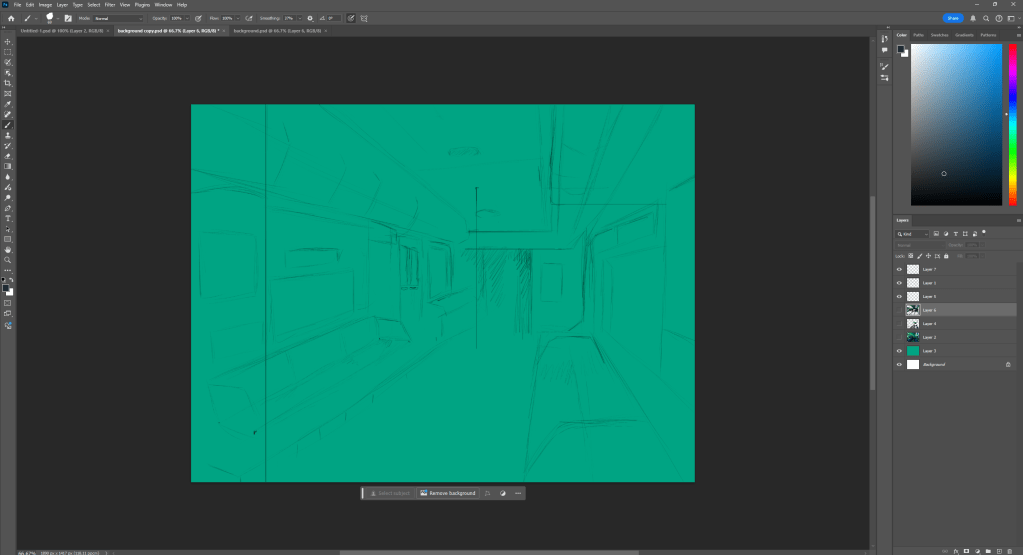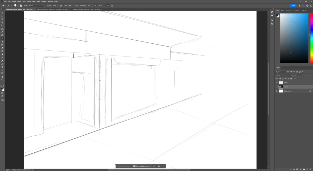 This was my first attempt at drawing a background in Photoshop, I first sketched it so I could understand the perspective. Since the reference I was using had an irregular angle that I had to change slightly.