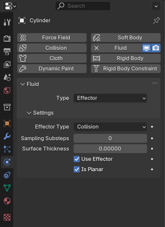 Then selected the glass and went to the physics tap, selected fluid then effector and ticked the box that said is planar so the object (the cylinder) will be an unclosed mesh.