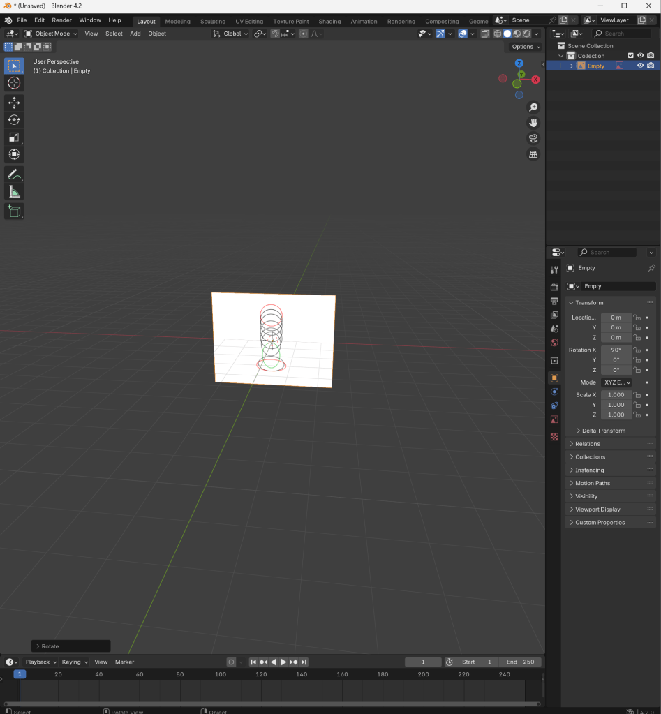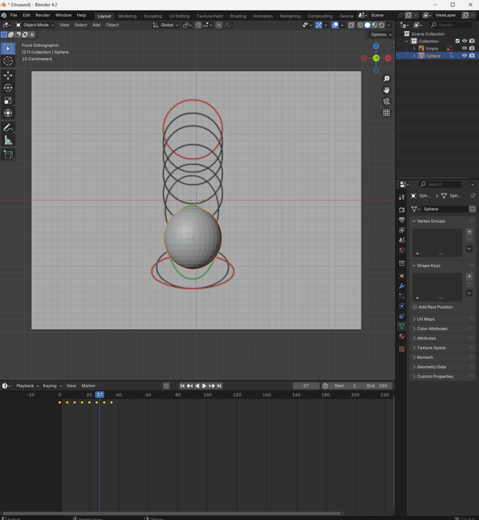 I used my reference as a guide to where I placed the spheres, once I was happy with where they were, I added a new key frame in the timeline below. I then saved the location by pressing k and started modelling the next key frame, once I did 4 I started altering the scale and rotation of the object so I had to start saving that to.