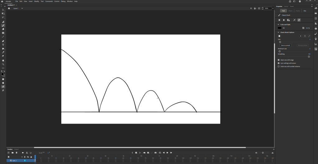 To create these animations I used adobe animate, this is my first time using the soft wear so I started with a simple bouncing ball animation, I used layer 1 to draw the floor and extended it so it would stay throughout the movement. i then used the second to draw on with onion skin on so i could keep track of what i was doing . I used squash and stretch on the animation on the left and i can see a clear difference in the two, the left one looks a lot more realistic and it is made clear that its a softer more flexible material.